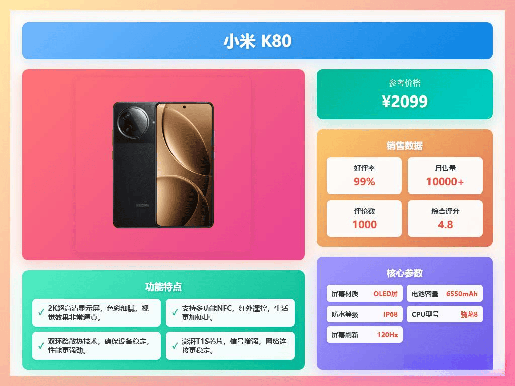 小米Redmi K80是一款非常出色的手机,搭载的第三代骁龙8处理器,运行程序毫无压力,无论是日常使用还是玩大型游戏都非常流畅。屏幕采用2K分辨率的OLED直屏,色彩还原自然,画面细腻震撼,观看视频和玩游戏的体验都非常享受。