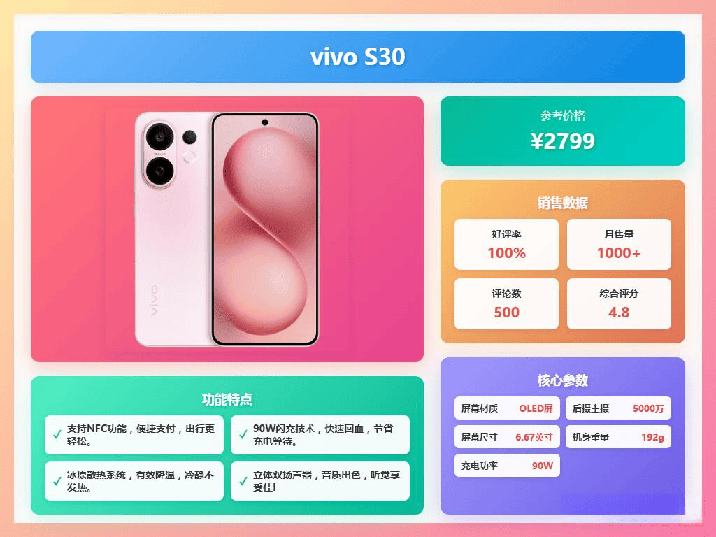 这款手机还支持红外遥控和NFC,功能丰富,日常生活中使用起来非常方便。外壳采用金刚盾三强玻璃,抗摔耐用性更强,符合IP64级别的抗水抗尘标准,日常小雨小水洒到也不用太担心。整体来说,vivo S30是一款性价比不错的手机,性能稳定,续航给力,屏幕高清护眼,功能全面,值得考虑。