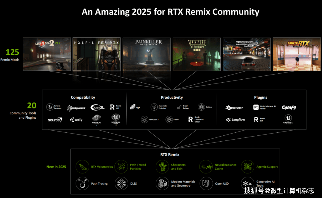 NVIDIA RTX Remix是NVIDIA着力打造的游戏MOD平台工具,迄今已经让《传送门》《半条命》《索尼克》等多款老游戏焕发了新生。在2025年内,RTX Remix平台产生了125款Remix模组、20款社区工具及插件,覆盖多款经典游戏。同时还实现了对Blender、ComfyUI、Langflow、Unity及Unreal等创作工具的完全兼容。