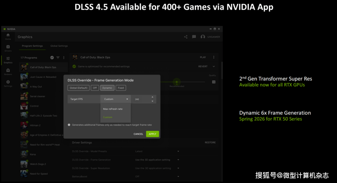 需要说明的是,DLSS 4.5是通过NVIDIA App以DLSS优设模式实现,目前已经支持超过400款游戏。DLSS 4.5带来的基于第二代Transformer模型的超分辨率技术现在已经开放支持全部的GeForce RTX GPU,而更核心的最高6倍的动态多帧生成功能预计将在2026年春季正式上线一样,动态多帧生成功能目前也仅有RTX 50系GPU可以享受。