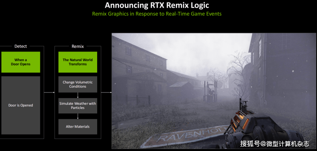 NVIDIA在会上给出的场景1:检测到“开门”事件→触发自然环境变换(调整体积光条件、粒子模拟天气以及修改材质)。