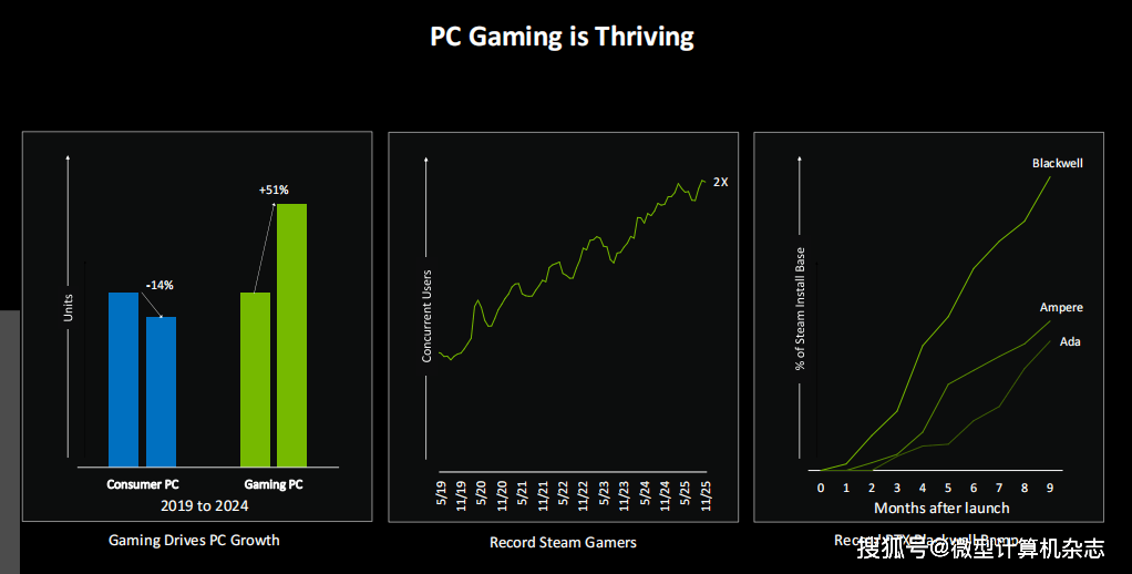 相关数据显示,2019年至2024年间,消费级PC销量下降了14%,但是在游戏PC这个领域的销量反而逆势增长51%,显然游戏领域已经成为PC增长的核心驱动力。同时,从Steam官方统计数据来看,该游戏平台的实时在线年发布的GeForce RTX Blackwell(RTX 50系)显卡在 Steam安装量中占比持续攀升,发布后市场渗透速度创历史新高。这一切数据都在表明——游戏市场在消费级PC领域已经占据了主导地位。
