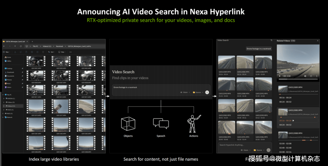 NVIDIA在会上还公布了AI视频搜索功能Nexa Hyperlink。其核心能力在于它是RTX优化的私有搜索工具,支持视频、图像、文档检索。这一搜索工具能够对视频内容进行精准定位:基于对象、语音或动作识别,检索视频片段(如“赛车无人机镜头”)。同时,它还支持大型视频库索引,可以按时间戳筛选片段,无需依赖文件名。这一工具目前已经开放测试申请,玩家可通过官网申请beta测试资格。